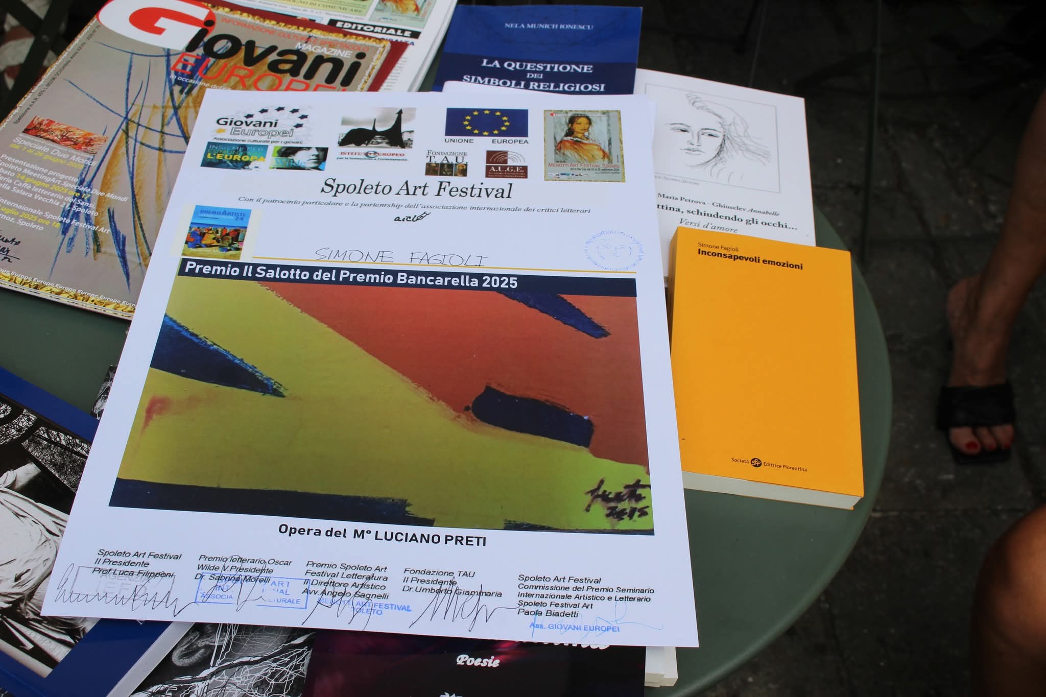 Omaggio a Simone Fagioli, poeta e filosofo spoletino, per la sua opera Inconsapevoli emozioni. Il riconoscimento, consegnato dal Sindaco Jacopo Ferri e dal Prof. Luca Filipponi al Salotto del Bancarella 2025, celebra un percorso letterario che ha già ricevuto premi come il “Gorgone D’Oro” e lo “SpoletoFestivalArt”.